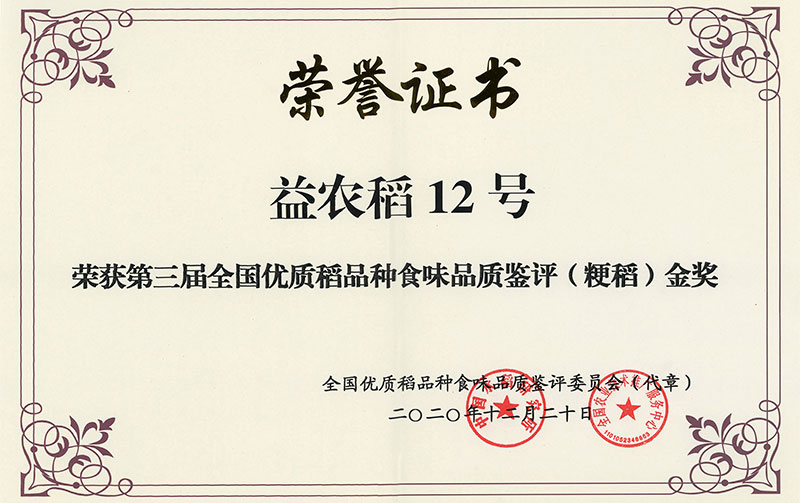 ag平台官网稻12号荣获金奖证书